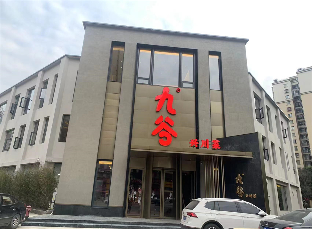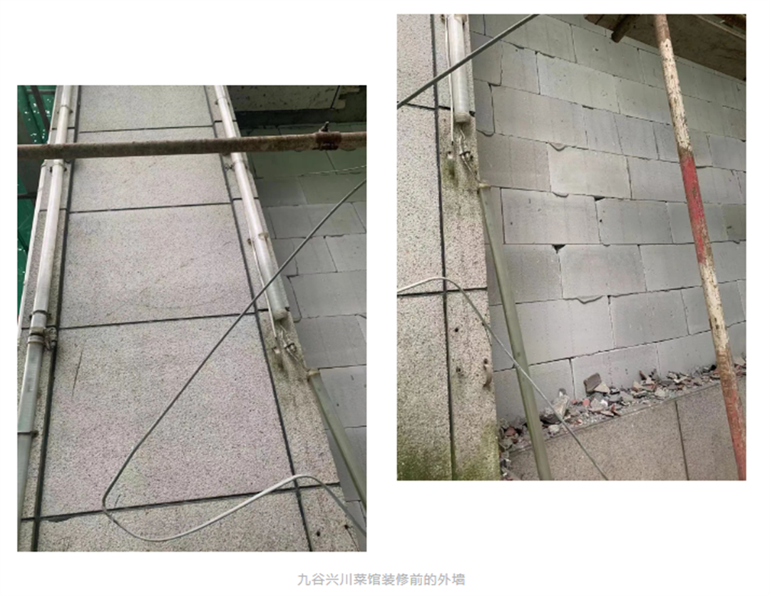 九谷興川菜是四川成都興熙北餐飲集團旗下的高端餐飲品牌,位于華美東街186號,翻新前是一家KTV,外墻采用的是真石漆和干掛石材,在歲月侵蝕下已經(jīng)非常陳舊,到處可見凌亂及污漬。