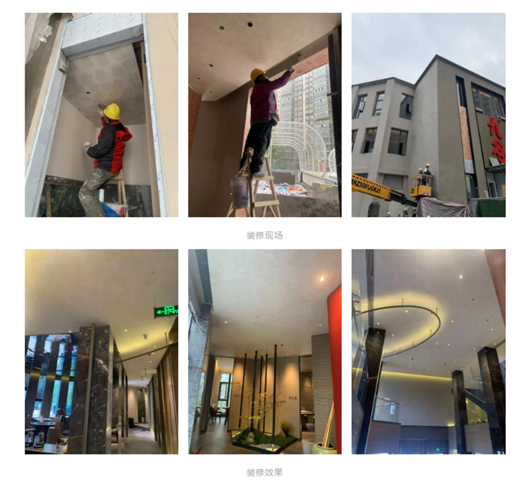 在經(jīng)過與項目承包方的詳細溝通后,嘉麗士根據(jù)建筑結構和工期要求,采用內外墻微水泥、外墻真石漆、頂面藝術漆產品組合,為九谷興川菜館量身打造了內外墻涂裝翻新解決方案。