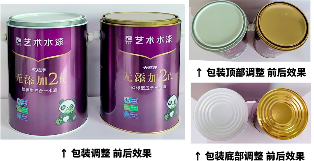 為進一步提升5L內(nèi)墻乳膠漆包裝質(zhì)量,改善市場反饋的環(huán)口生銹問題,公司經(jīng)過近幾個月的產(chǎn)品熱儲、破壞性測試、竟品對標分析及與供應商的深入討論,于2025年4月22日起將5L乳膠漆包裝罐的底座、環(huán)口、桶蓋顏色由白色調(diào)整為金色。