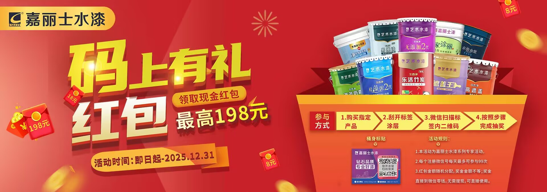 嘉麗士水漆 推出 “碼上有禮” 紅包活動,最高可領198元!不管是1.8 元、5.8元,38元,還是超級幸運的198 元,每一個紅包都是嘉麗士水漆對大家的誠意與回饋。